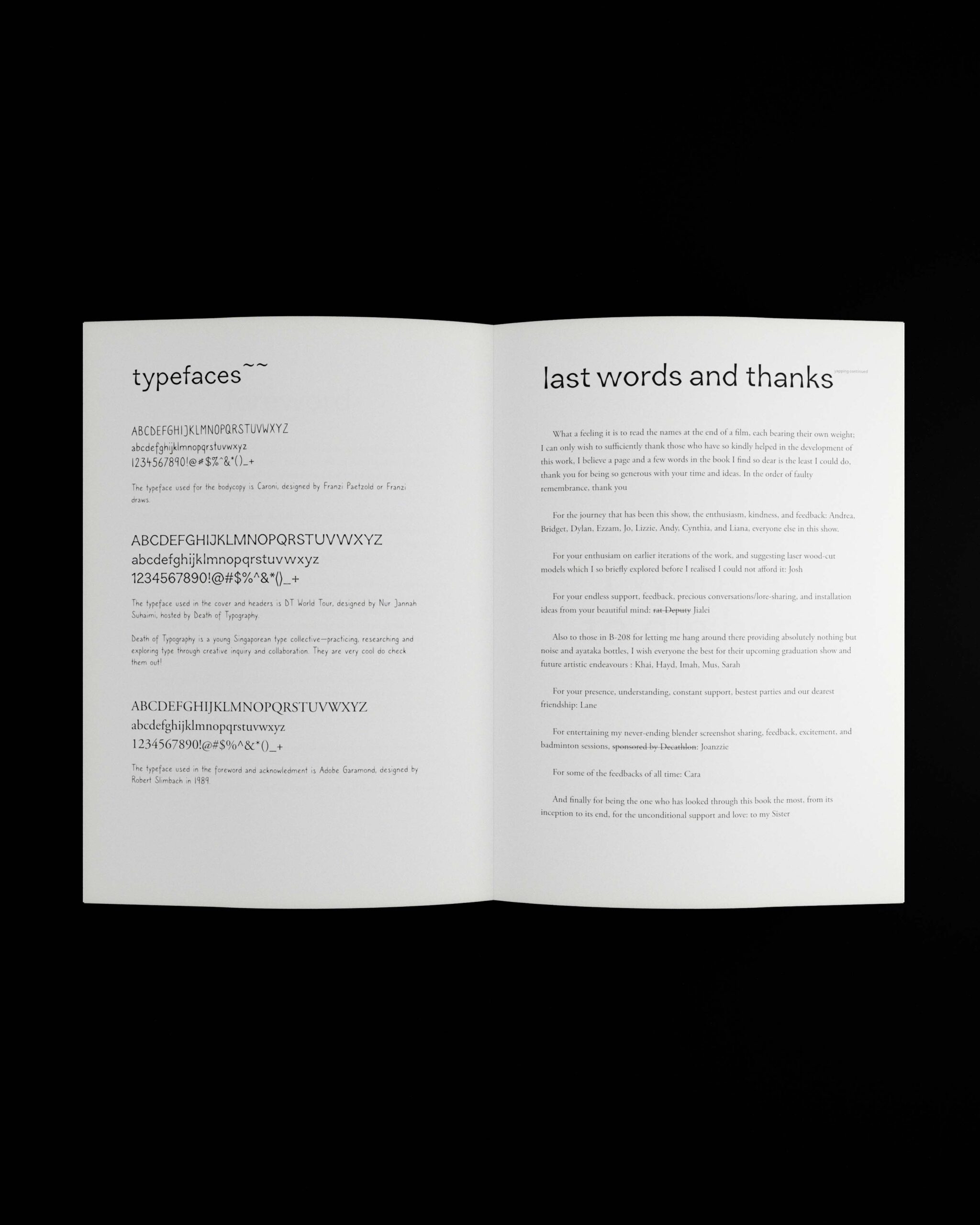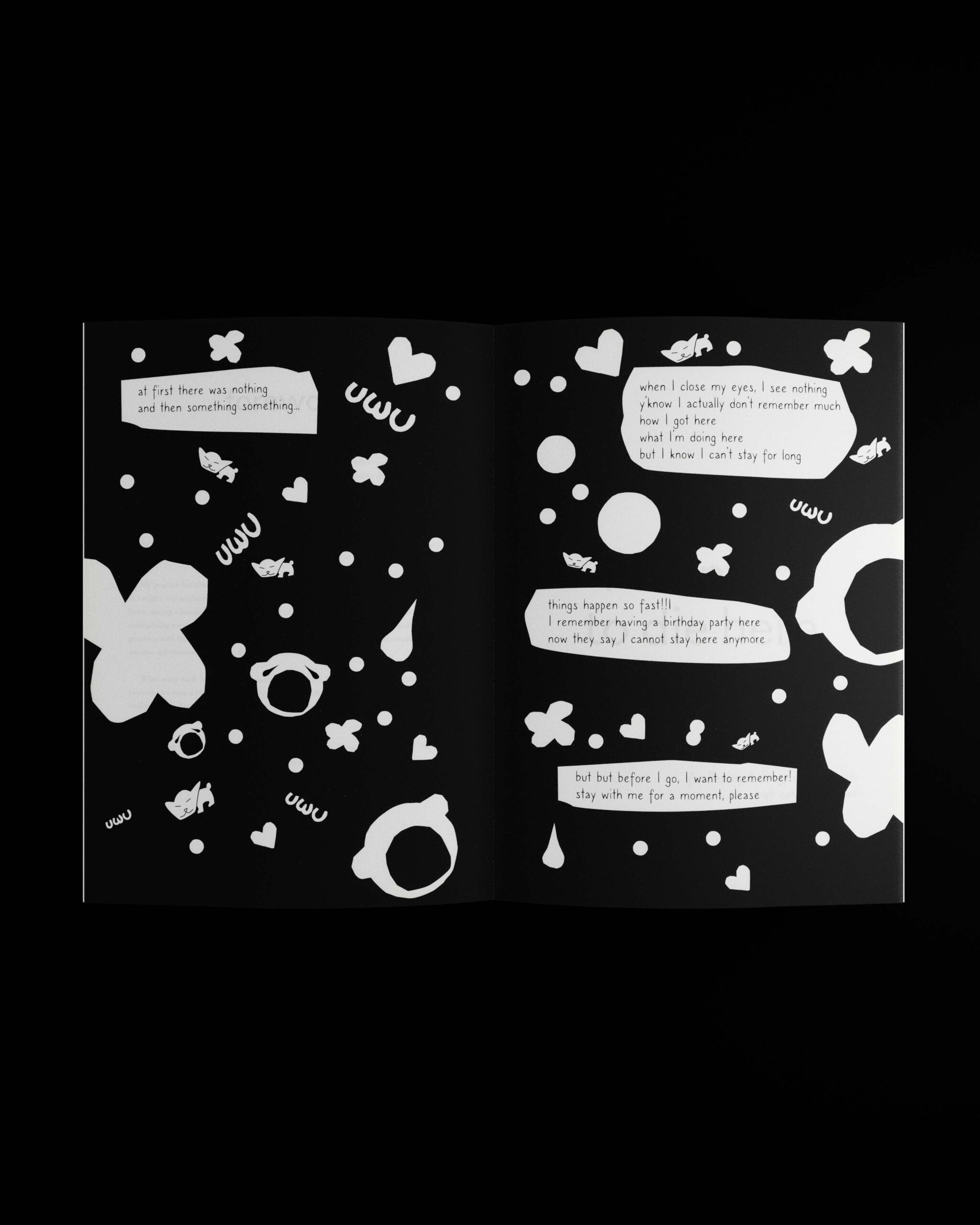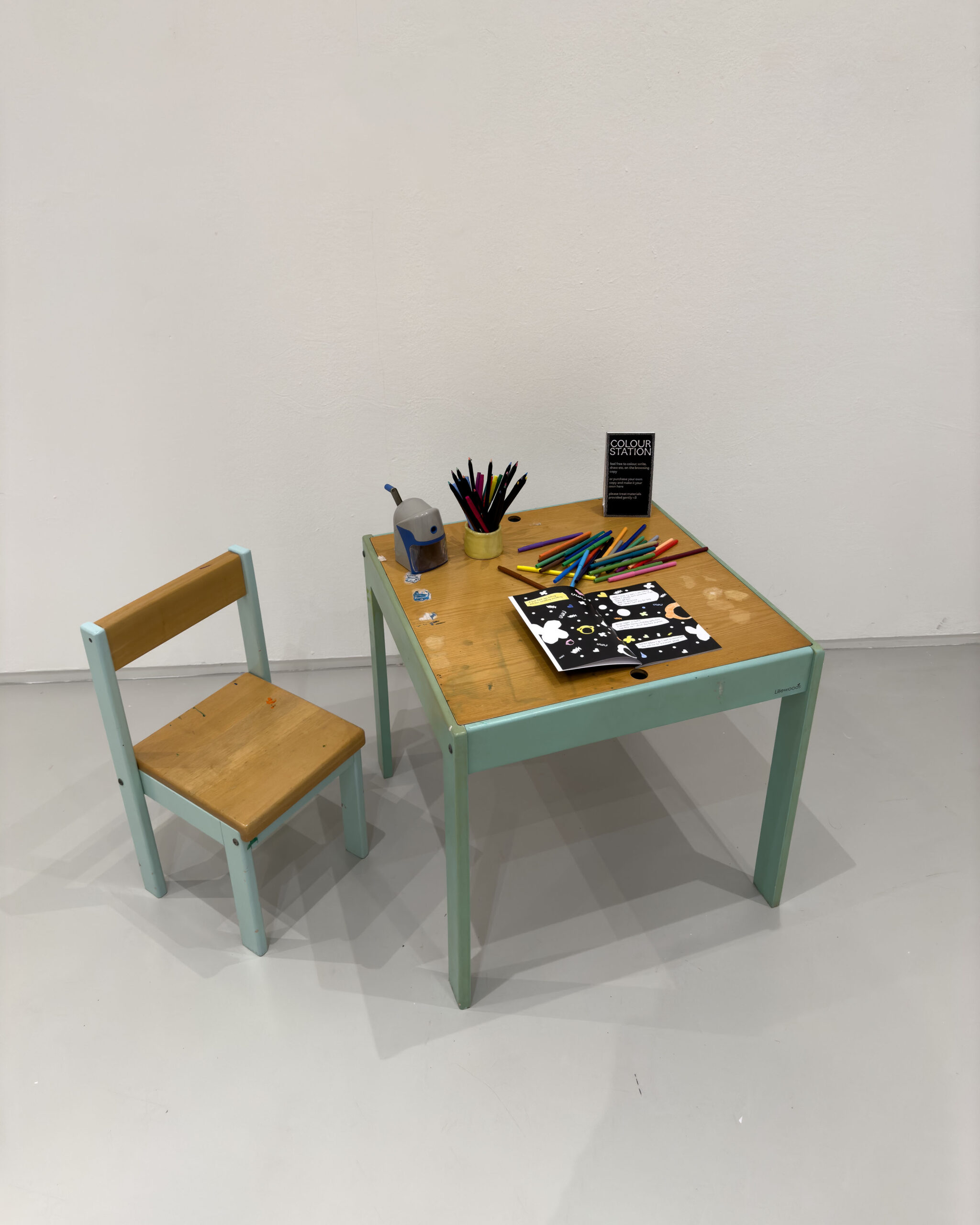 The artist explores the displacement of space and memory, and laments the loss of home with the recollection of memory, collected words, and illustrated documentations of space. The work is presented as a storybook, a self-published work of fiction to process the emotions of loss, worry, and love through the voice of a child. Audiences are invited to write, colour, and decorate the book. Thematically, this work at once explores the commodification of self i.e. the artists must sell absolute parts of themselves to perpetuate production, and the wish for a gentle parting with home.